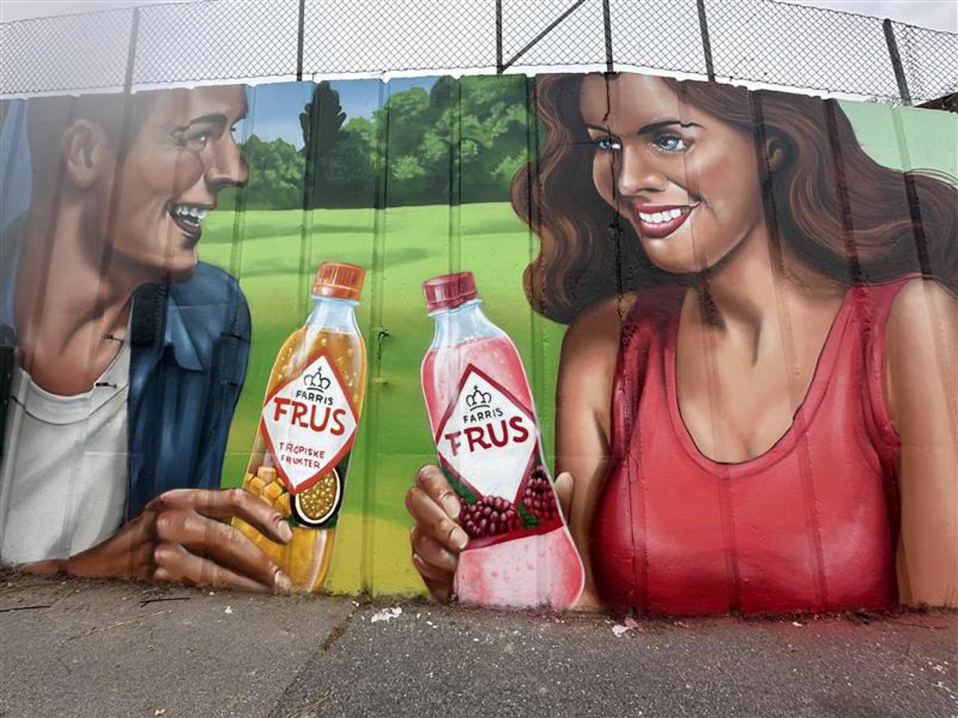– Vi har lenge hatt et ønske om å gjøre noe med den triste betongveggen langs veien ved Farris-fabrikken. Det er en ganske stor flate, så vi tenkte det hadde vært artig å se på hvordan vi kunne utnytte den til å vise frem Farrishistorien, sier Juliane Øyslebø, markedssjef for vann i Ringnes.